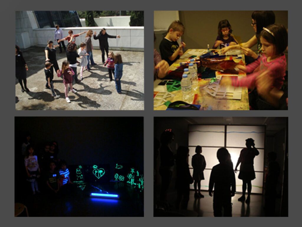The Educational Department of Tellogleion Arts Foundation collaborated with Beforelight to develop a creative workshop in two parts, based on the theme of light. The first part was entitled “In the shadow of the tiny giants” and focused in the relationship between light, objects and shadow and the creation of a painting made of shadows. The workshop concluded with an custom-made construction to map shadow motifs. The second meeting was named “Colours and Scents” and aimed to the discovery of the multiple colours hiding inside white colour, as well as the study of the light spectrum. Using colour filters and a series of UV sensitive material, children had the opportunity to create “ghost paintings”.
